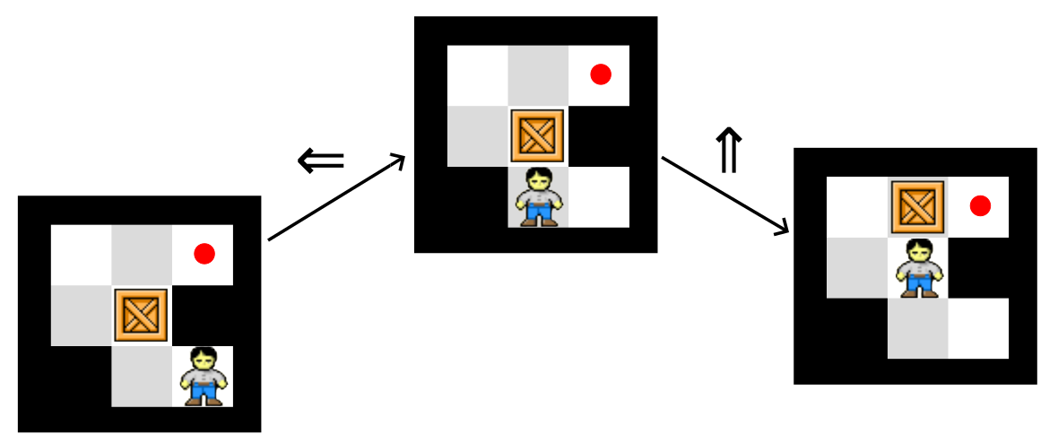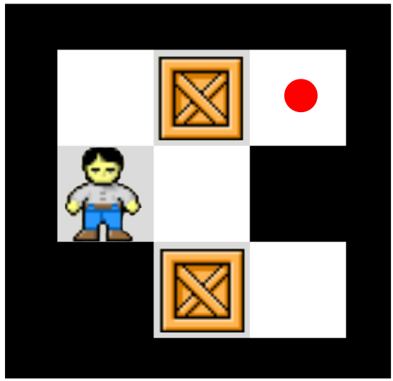 Sokoban is a puzzle videogame developed by Thinking Rabbit in the 1980s. The format of the game is very similar to a directional maze: you control a character by instructing them to perform one of four legal moves \(\{\Uparrow, \Rightarrow, \Leftarrow, \Downarrow\}\) to move from one legal position to another. The difference is an added element: there are boxes you have to push into certain finishing positions. It's a little easier to understand the game once you've played it a bit.