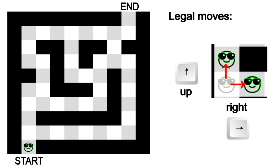 - A set of legal moves \(A \subseteq \{\Uparrow, \Downarrow, \Rightarrow, \Leftarrow\}\)