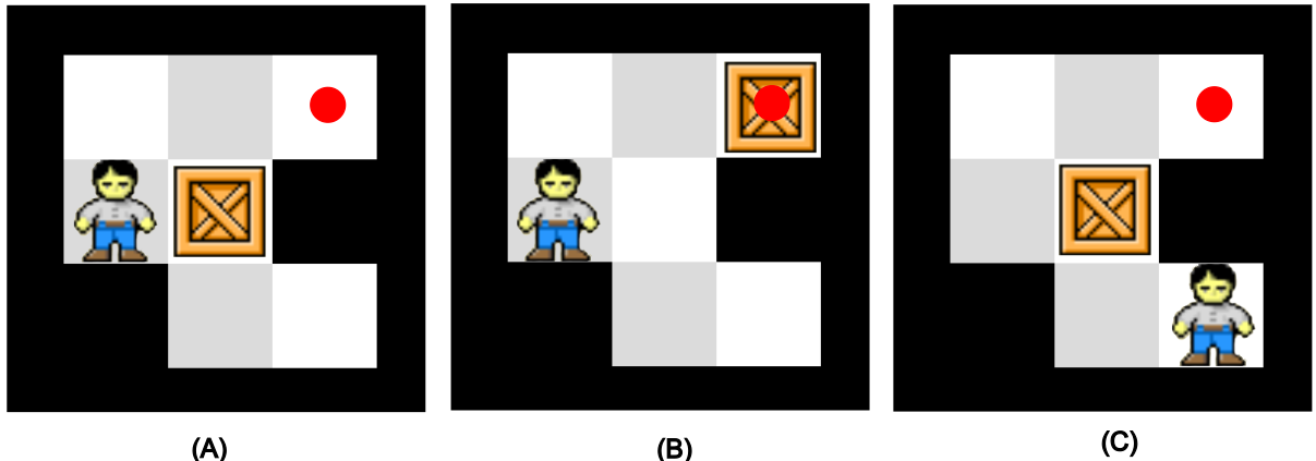 Two state transitions between three states \(s_0,s_1,s_2\), respectively, of of Sokoban game (A).